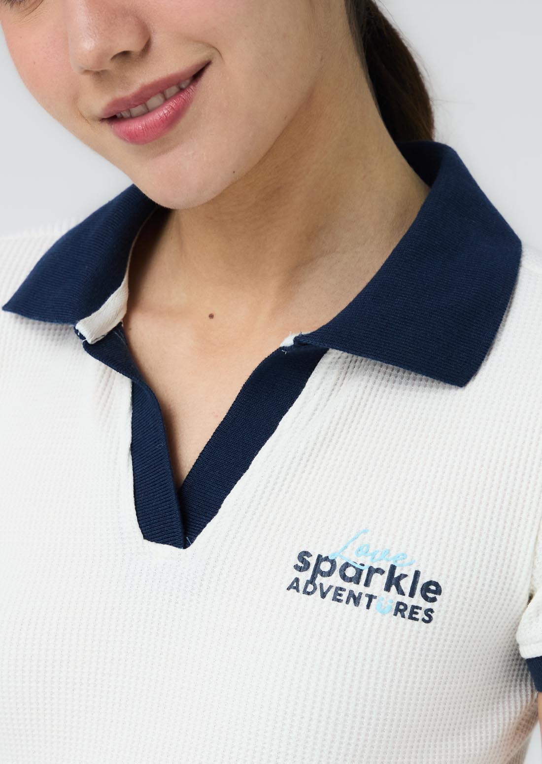 Vestido corto, manga corta, color marfil, cuello camisero y estampado en frente para jóvenes.