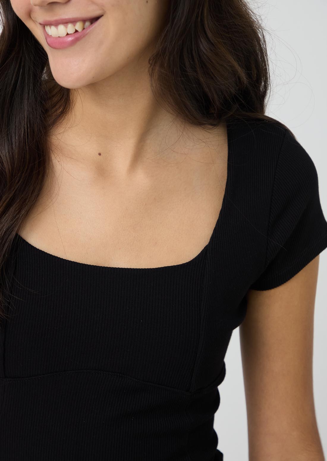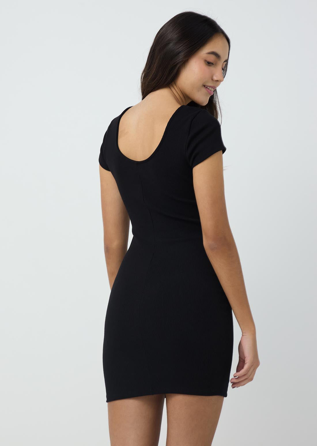 Vestido manga corta, color negro, con cortes en frente, fondo entero y escote cuadrado para jóvenes.
