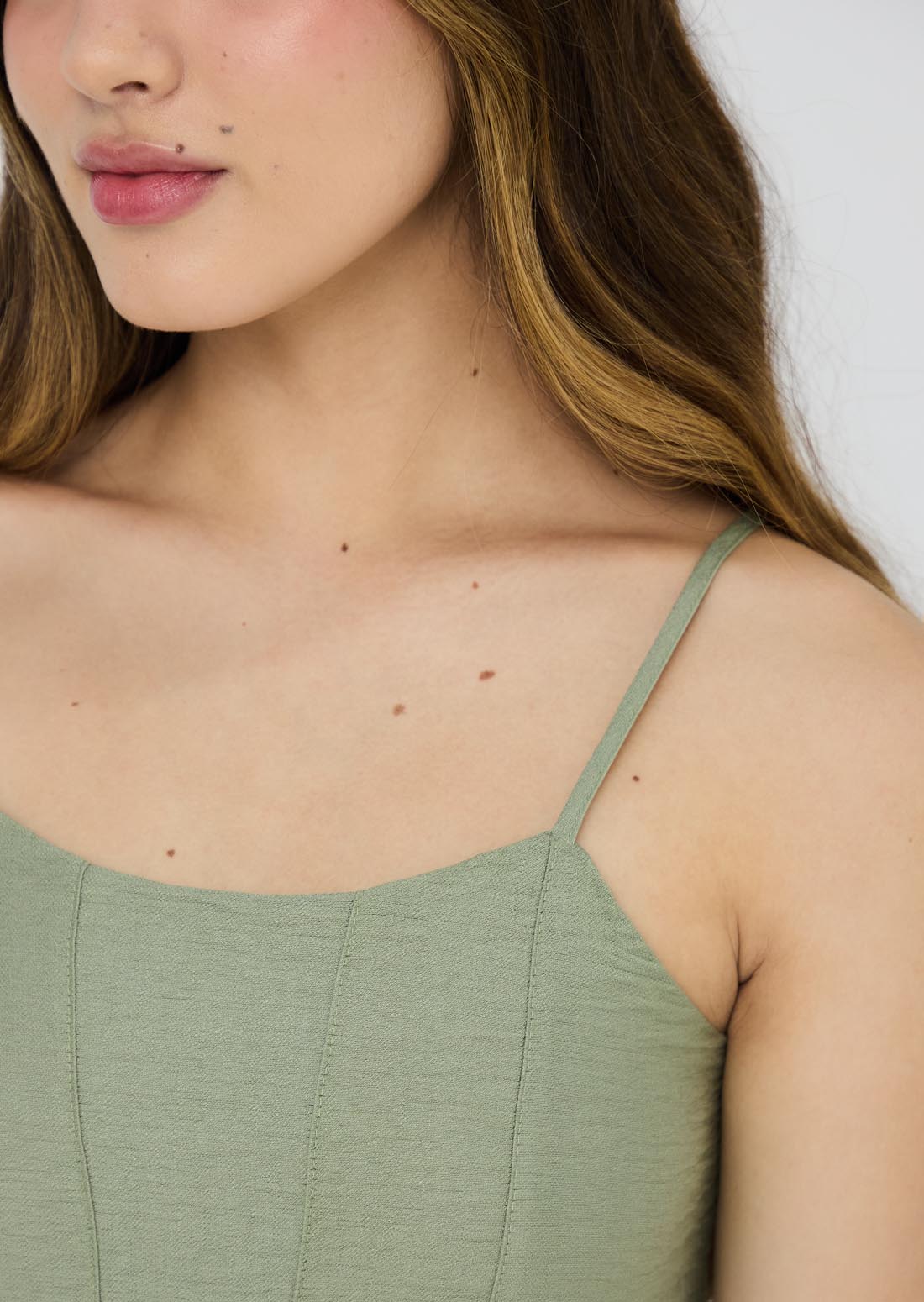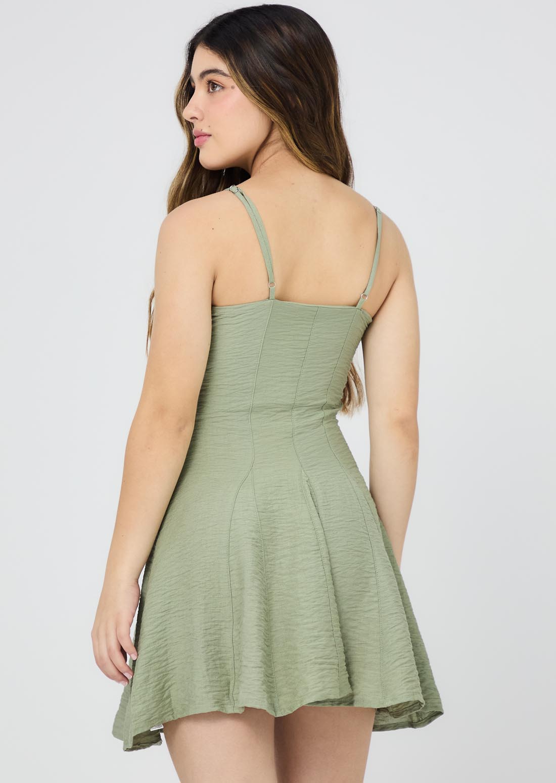 Vestido de tiras, color verde militar, fondo entero y con cortes para jóvenes.